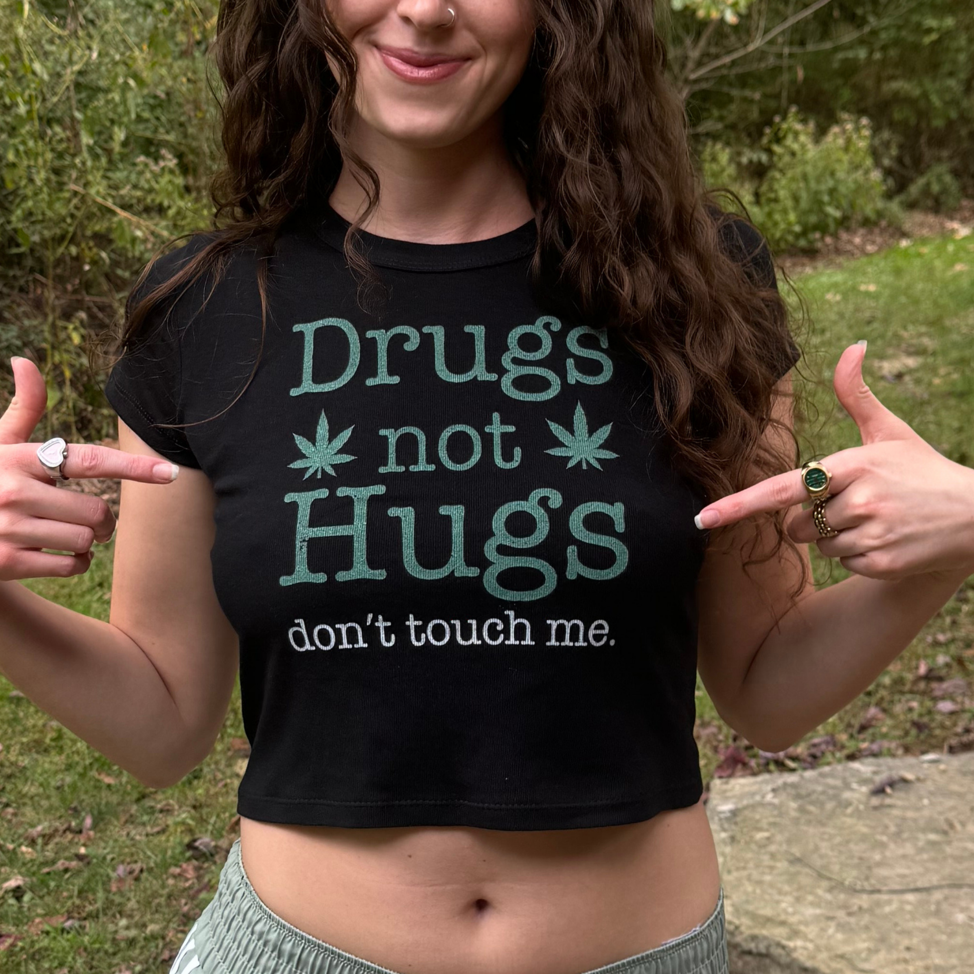 WOMEN’S BABY TEE WITH “drugs not hugs” design printed on front of our classic tank top